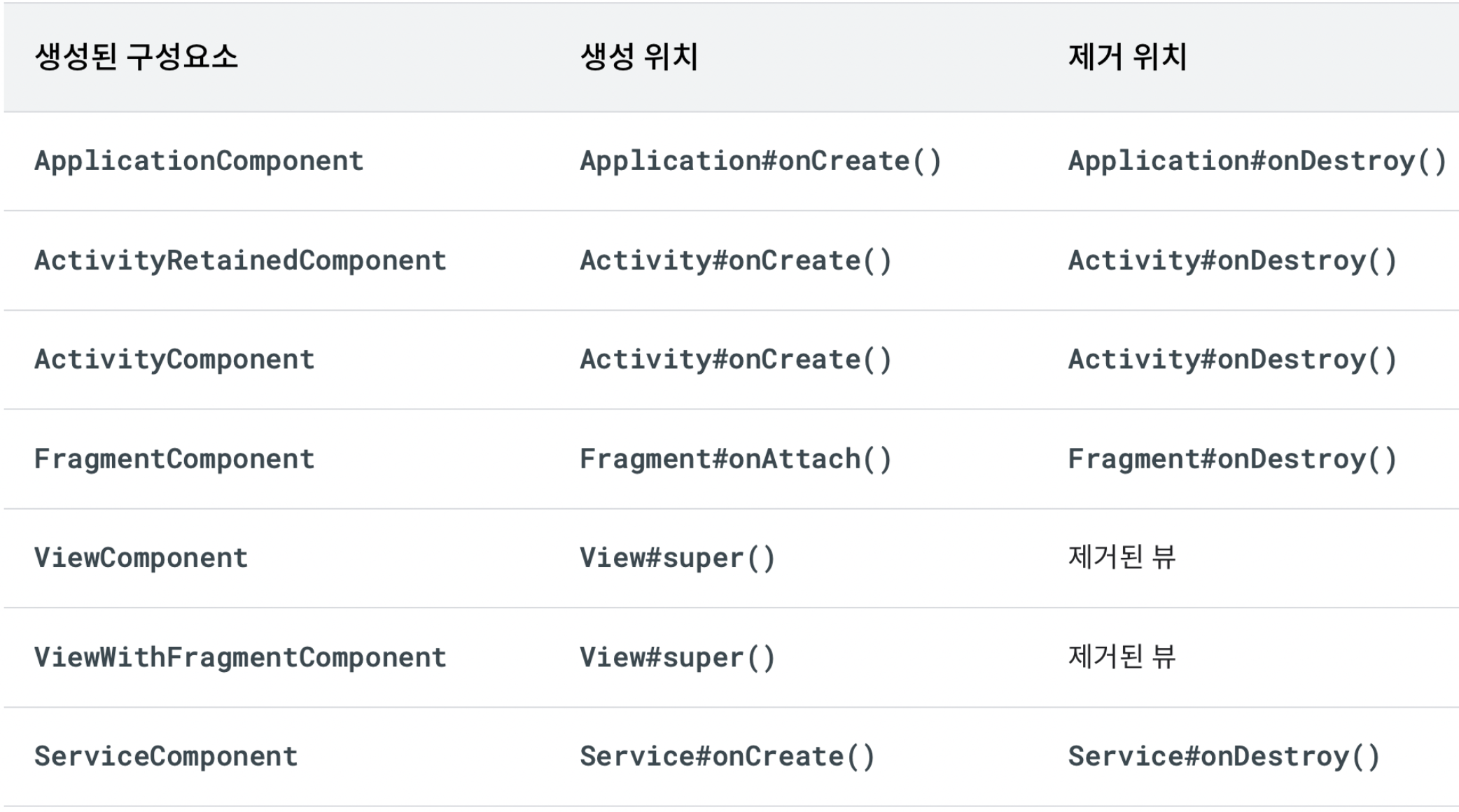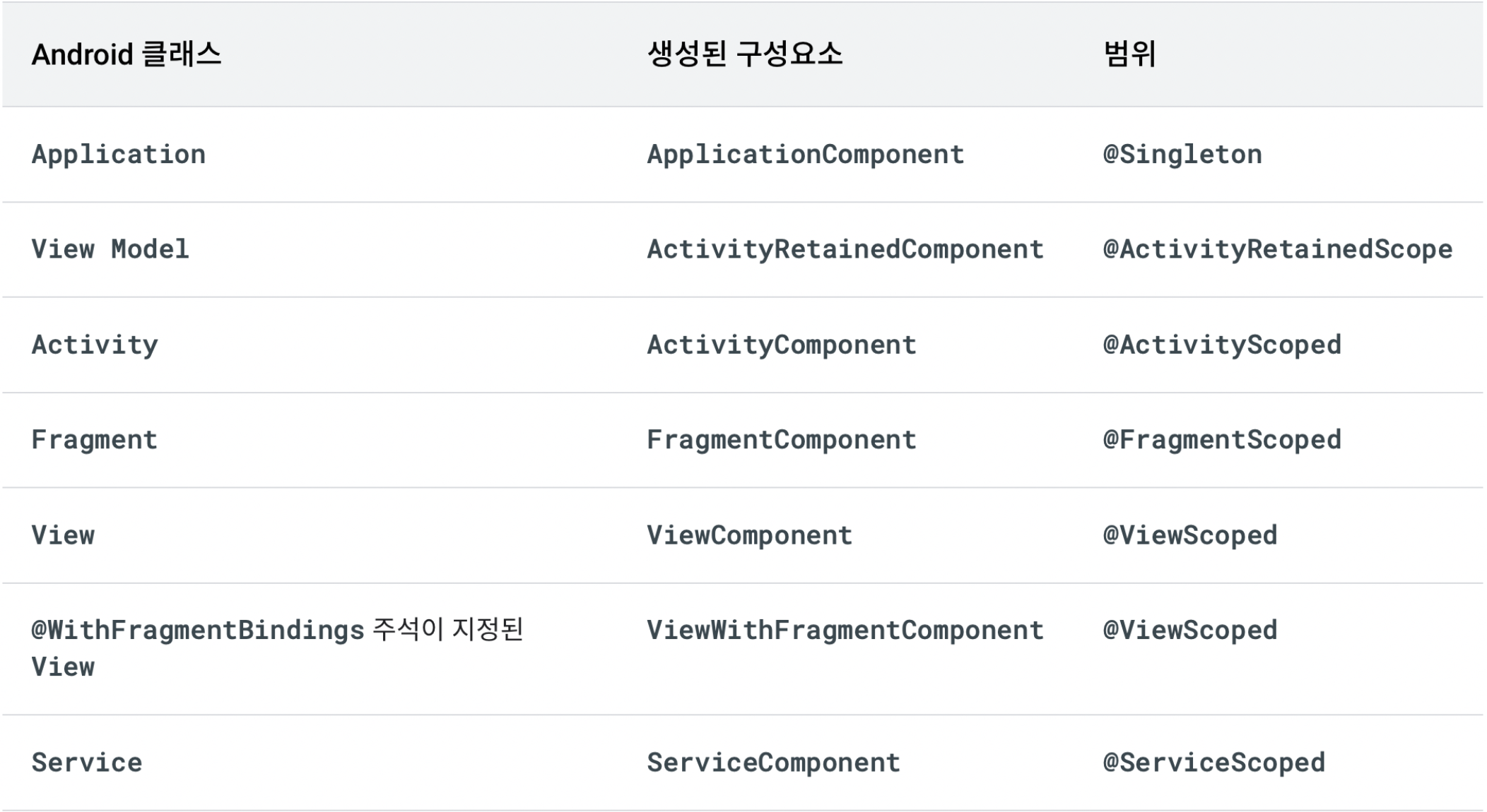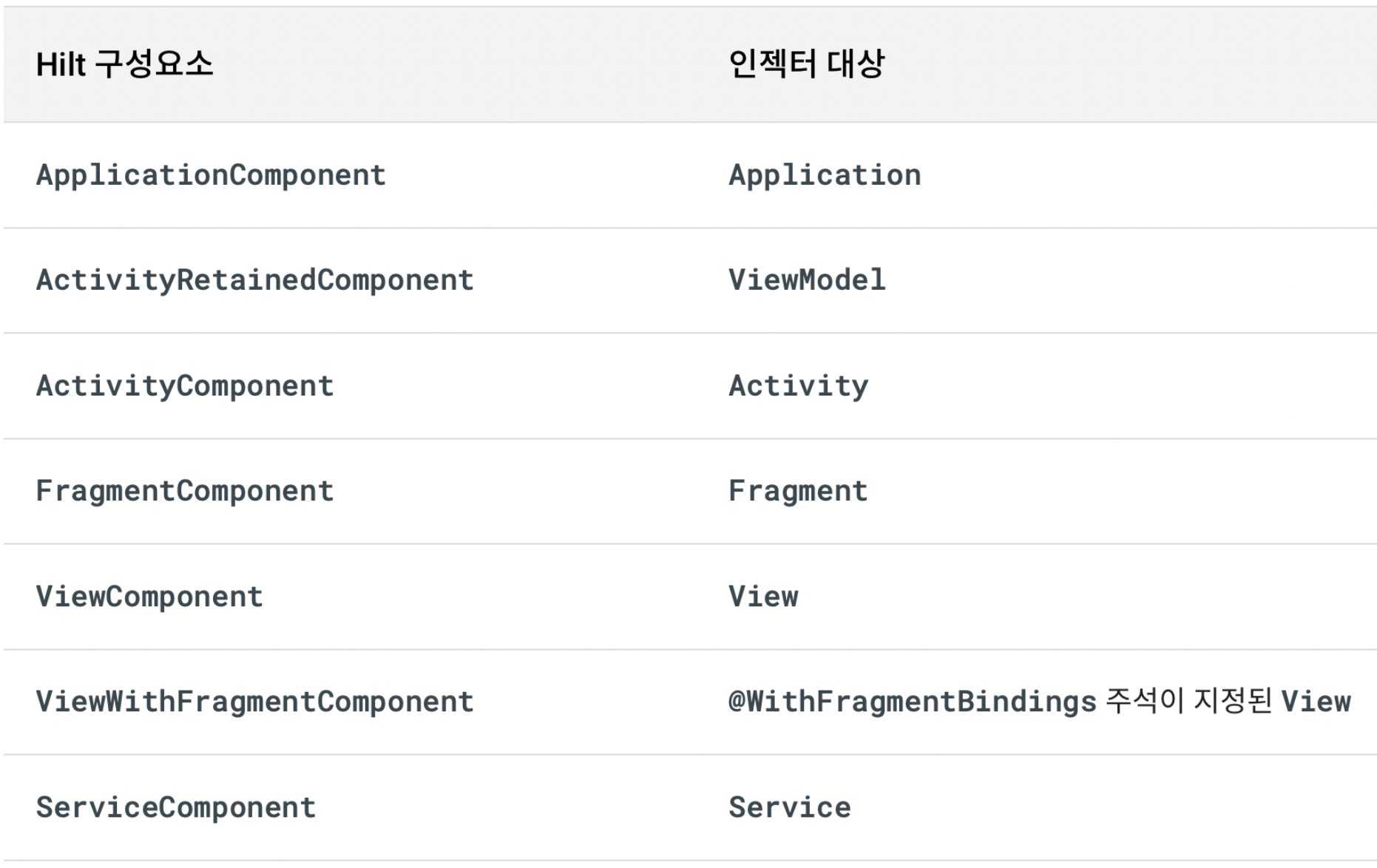 - https://developer.android.com/training/dependency-injection/hilt-android?hl=ko#component-hierarchy