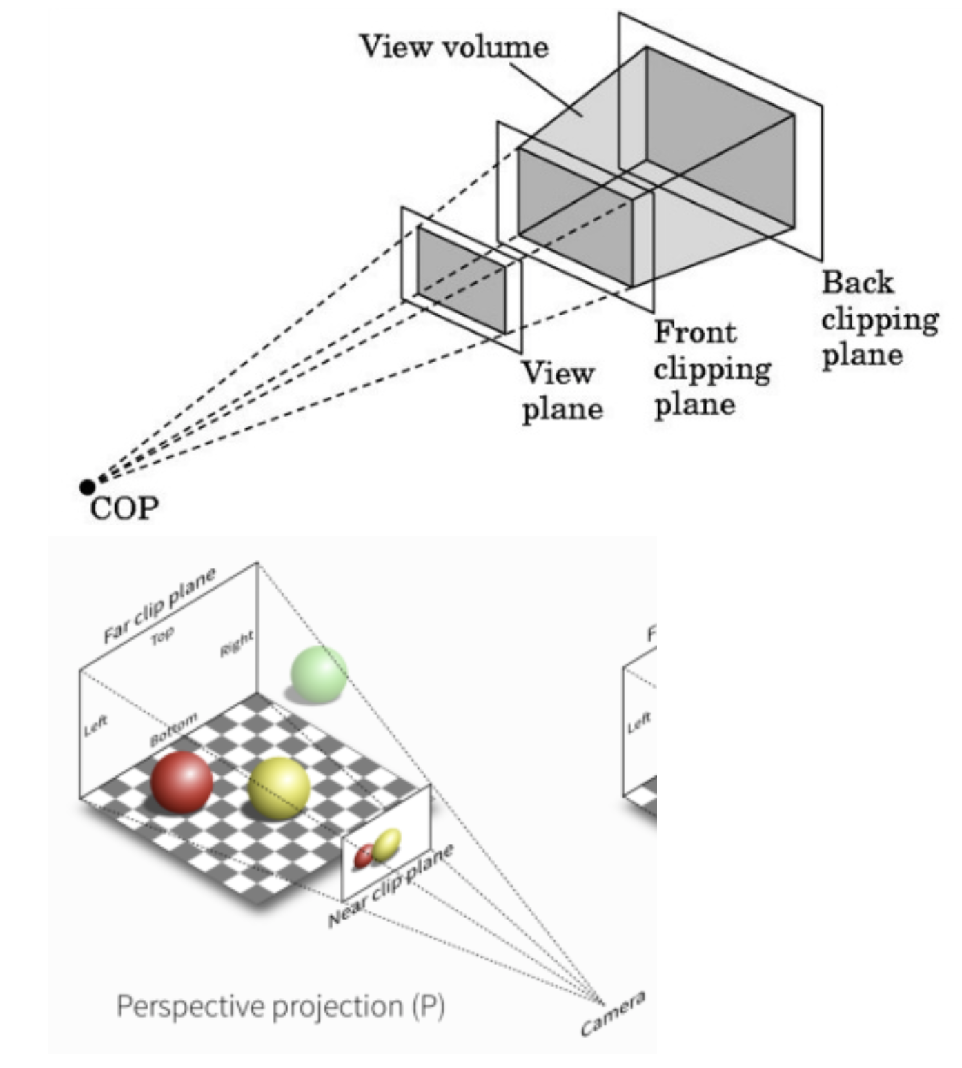 - Projection : 투영, 카메라가 모델을 볼 수 있는 공간