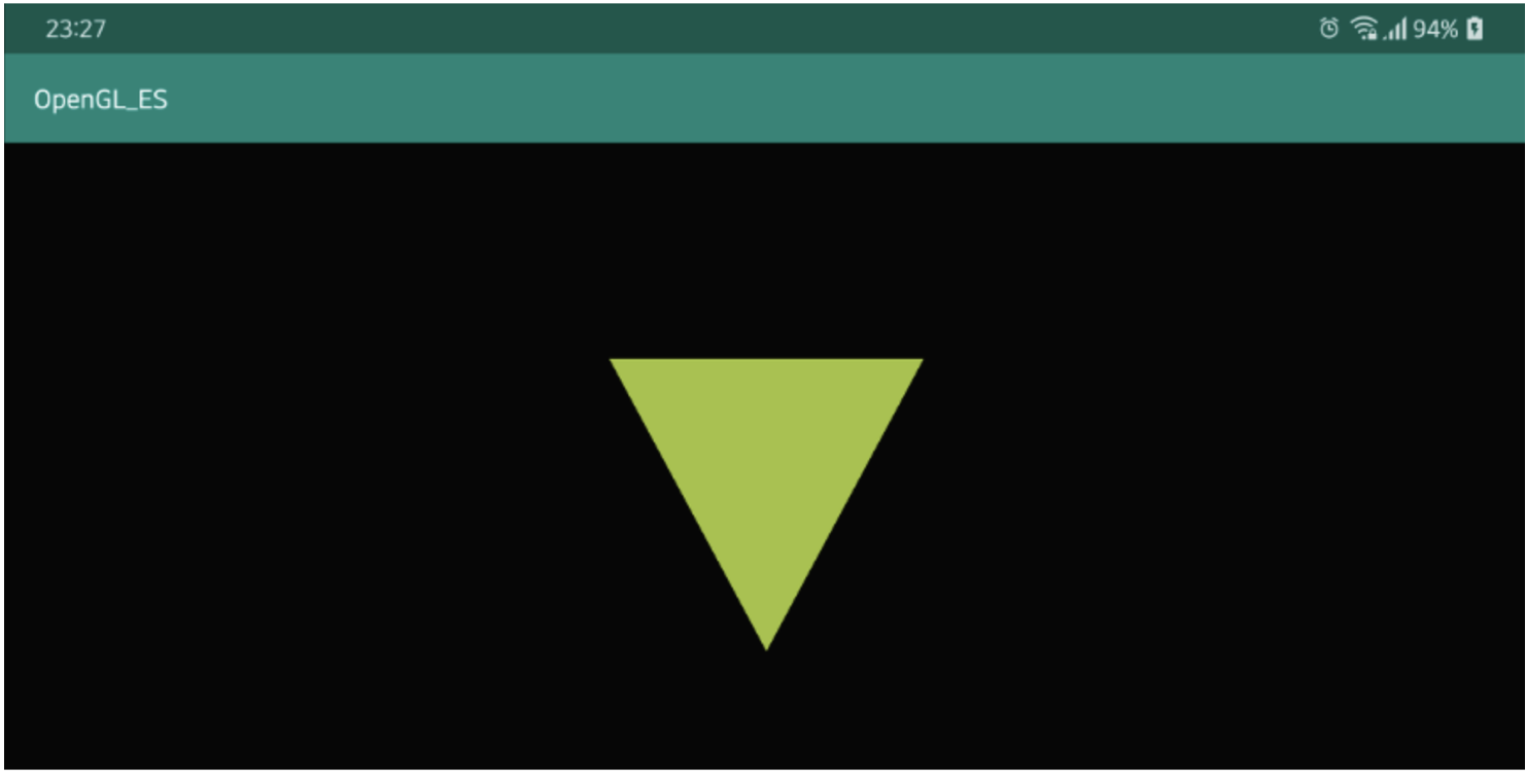 fun loadShader(type: Int, shaderCode: String): Int { // create a vertex shader type (GLES20.GL_VERTEX_SHADER) // or a fragment shader type (GLES20.GL_FRAGMENT_SHADER) return GLES20.glCreateShader(type).also { shader -> // add the source code to the shader and compile it GLES20.glShaderSource(shader, shaderCode) GLES20.glCompileShader(shader) } } ----------------------------------------------------------------- class Triangle { ... private var mProgram: Int init { ... val vertexShader: Int = loadShader(GLES20.GL_VERTEX_SHADER, vertexShaderCode) val fragmentShader: Int = loadShader(GLES20.GL_FRAGMENT_SHADER, fragmentShaderCode) // create empty OpenGL ES Program mProgram = GLES20.glCreateProgram().also { // add the vertex shader to program GLES20.glAttachShader(it, vertexShader) // add the fragment shader to program GLES20.glAttachShader(it, fragmentShader) // creates OpenGL ES program executables GLES20.glLinkProgram(it) } } } ----------------------------------------------------------------- private var positionHandle: Int = 0 private var mColorHandle: Int = 0 private val vertexCount: Int = triangleCoords.size / COORDS_PER_VERTEX private val vertexStride: Int = COORDS_PER_VERTEX * 4 // 4 bytes per vertex fun draw() { // Add program to OpenGL ES environment GLES20.glUseProgram(mProgram) // get handle to vertex shader's vPosition member positionHandle = GLES20.glGetAttribLocation(mProgram, "vPosition").also { // Enable a handle to the triangle vertices GLES20.glEnableVertexAttribArray(it) // Prepare the triangle coordinate data GLES20.glVertexAttribPointer( it, COORDS_PER_VERTEX, GLES20.GL_FLOAT, false, vertexStride, vertexBuffer ) // get handle to fragment shader's vColor member mColorHandle = GLES20.glGetUniformLocation(mProgram, "vColor").also { colorHandle -> // Set color for drawing the triangle GLES20.glUniform4fv(colorHandle, 1, color, 0) } // Draw the triangle GLES20.glDrawArrays(GLES20.GL_TRIANGLES, 0, vertexCount) // Disable vertex array GLES20.glDisableVertexAttribArray(it) } } ------------------------------------------------------------------- override fun onDrawFrame(unused: GL10) { ... triangle.draw() }Wrong Result