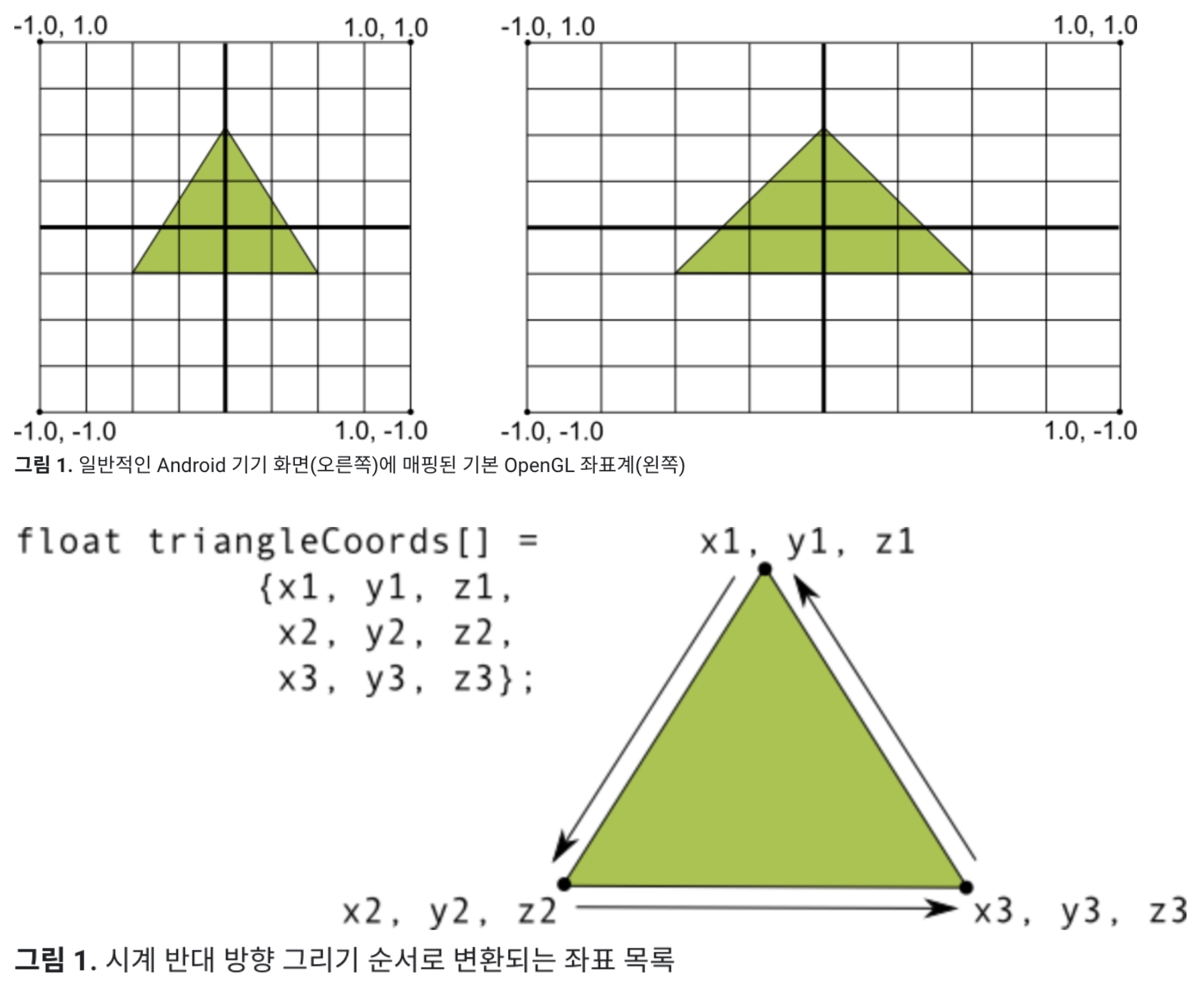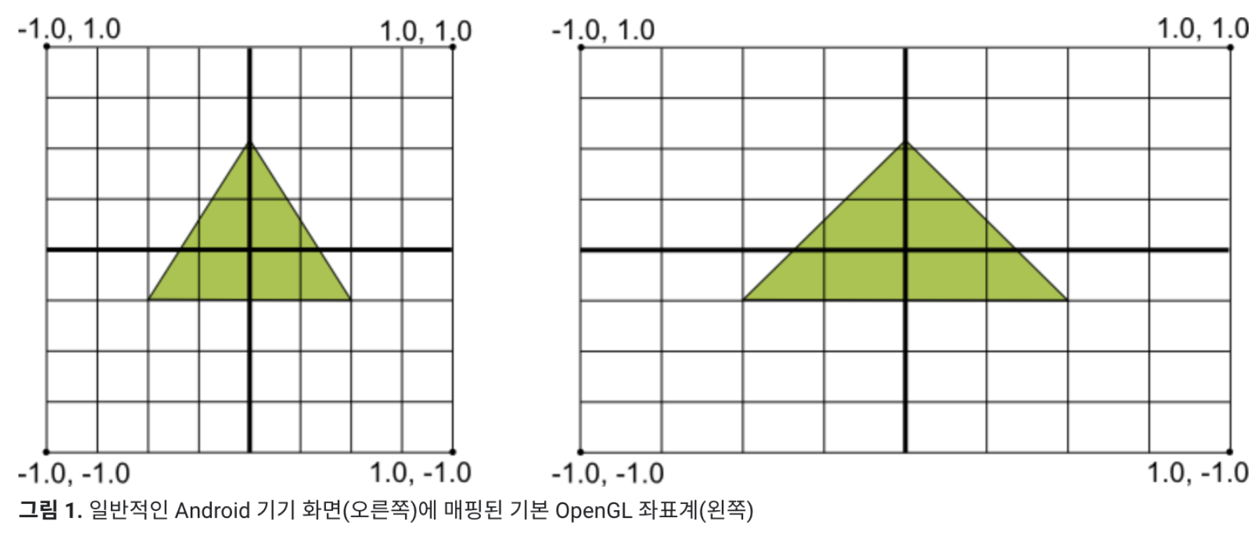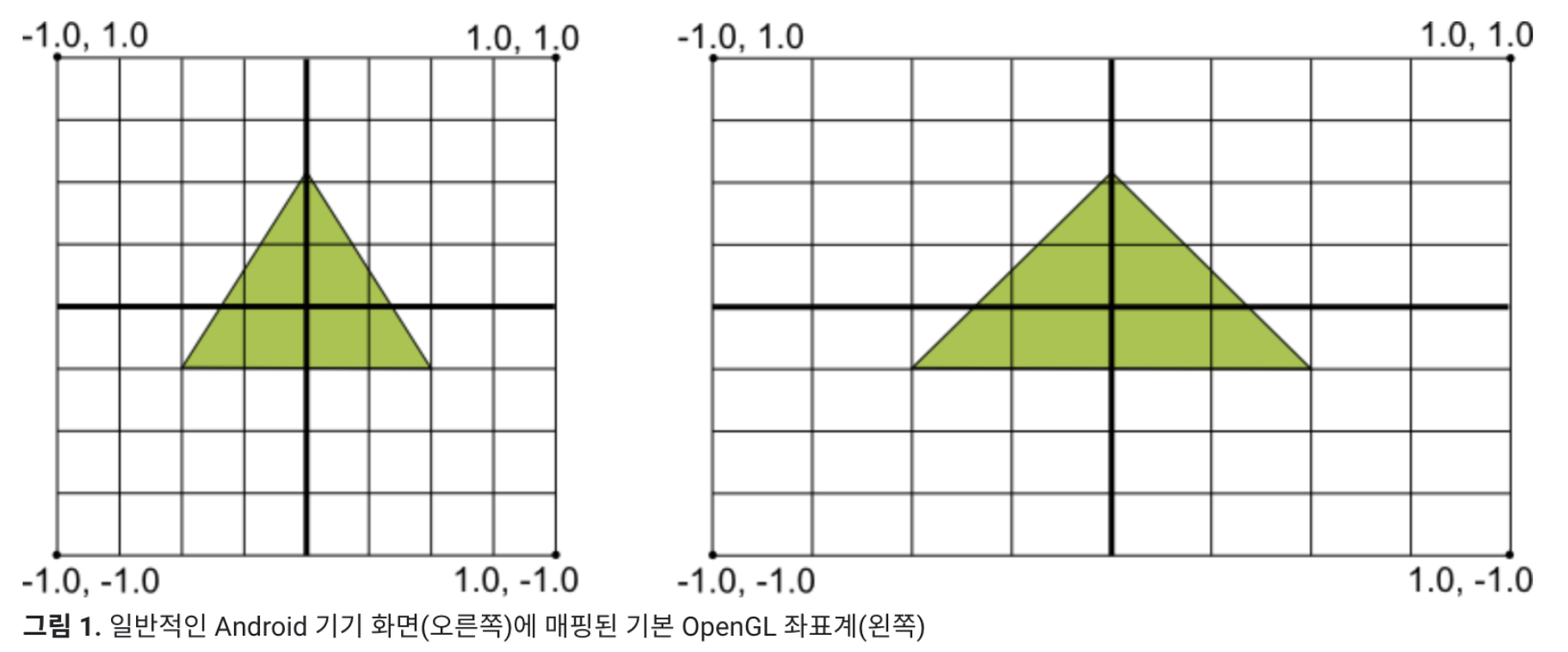 - 기본적으로 OpenGL ES는 좌표계에서 [0,0,0](X,Y,Z)은 GLSurfaceView 프레임의 중심을 지정하고, [1,1,0]은 프레임의 오른쪽 상단을 지정하며, [-1,-1,0]은 프레임의 왼쪽 하단을 지정한다고 간주합니다.