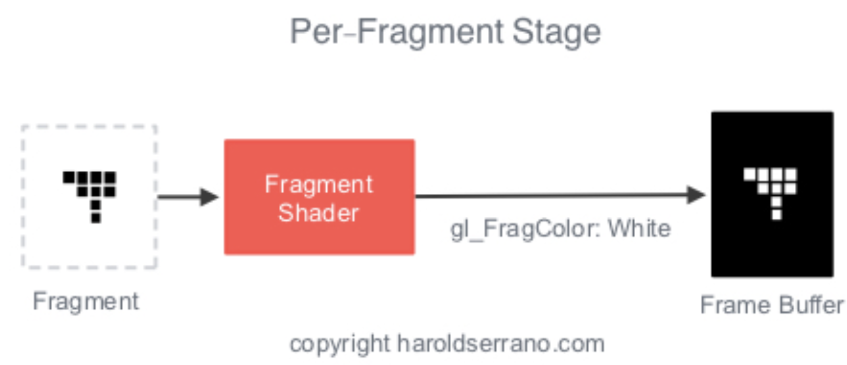 - Fragment Shader의 주목적은 GPU에게 최종적인 프레그먼트의 색이 무엇이 되어야 하는지 알려주는 것이다. 기본 요소의 모든 프레그먼트에 대해 한 번씩 호출되므로 삼각형이 1000개의 프레그먼트로 매핑되면 Fragment Shader는 1000번 호출된다.