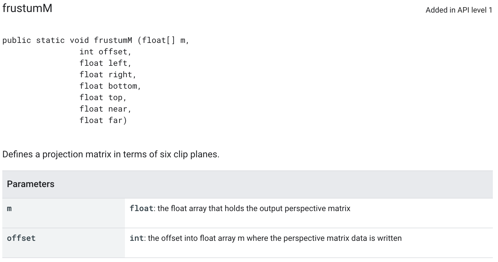 // vPMatrix is an abbreviation for "Model View Projection Matrix" private val vPMatrix = FloatArray(16) private val projectionMatrix = FloatArray(16) private val viewMatrix = FloatArray(16) override fun onSurfaceChanged(unused: GL10, width: Int, height: Int) { GLES20.glViewport(0, 0, width, height) val ratio: Float = width.toFloat() / height.toFloat() // this projection matrix is applied to object coordinates // in the onDrawFrame() method Matrix.frustumM(projectionMatrix, 0, -ratio, ratio, -1f, 1f, 3f, 7f) }