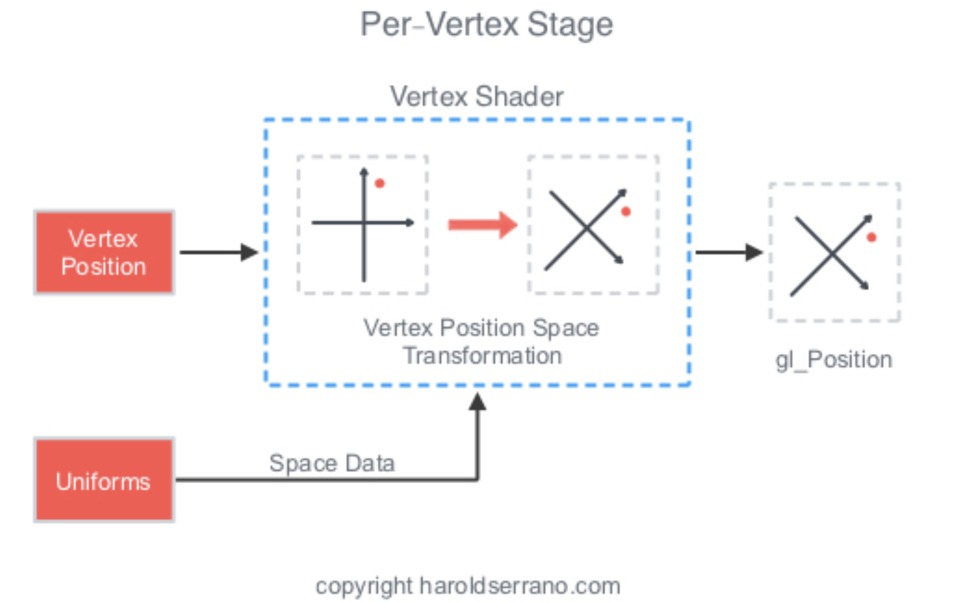 - 각 정점의 최종 위치를 생성하며 정점마다 한번씩 실행됩니다. 일단 최종 위치가 알려지면, OpenGL은 보이는 정점 집합을 취해 점, 선 및 삼각형으로 만듭니다.