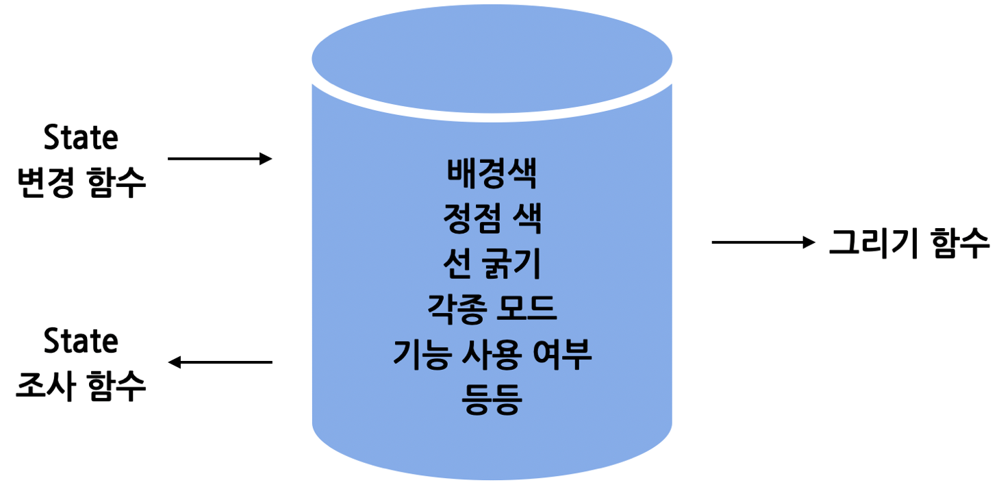 - 상태 머신이란 상태를 저장하는 장소이며 그리기에 영향을 미치는 여러 변수값들의 집합이다.