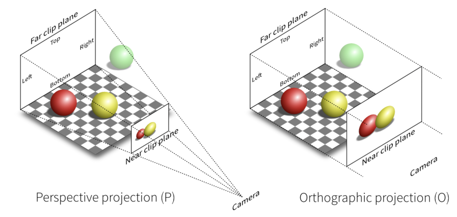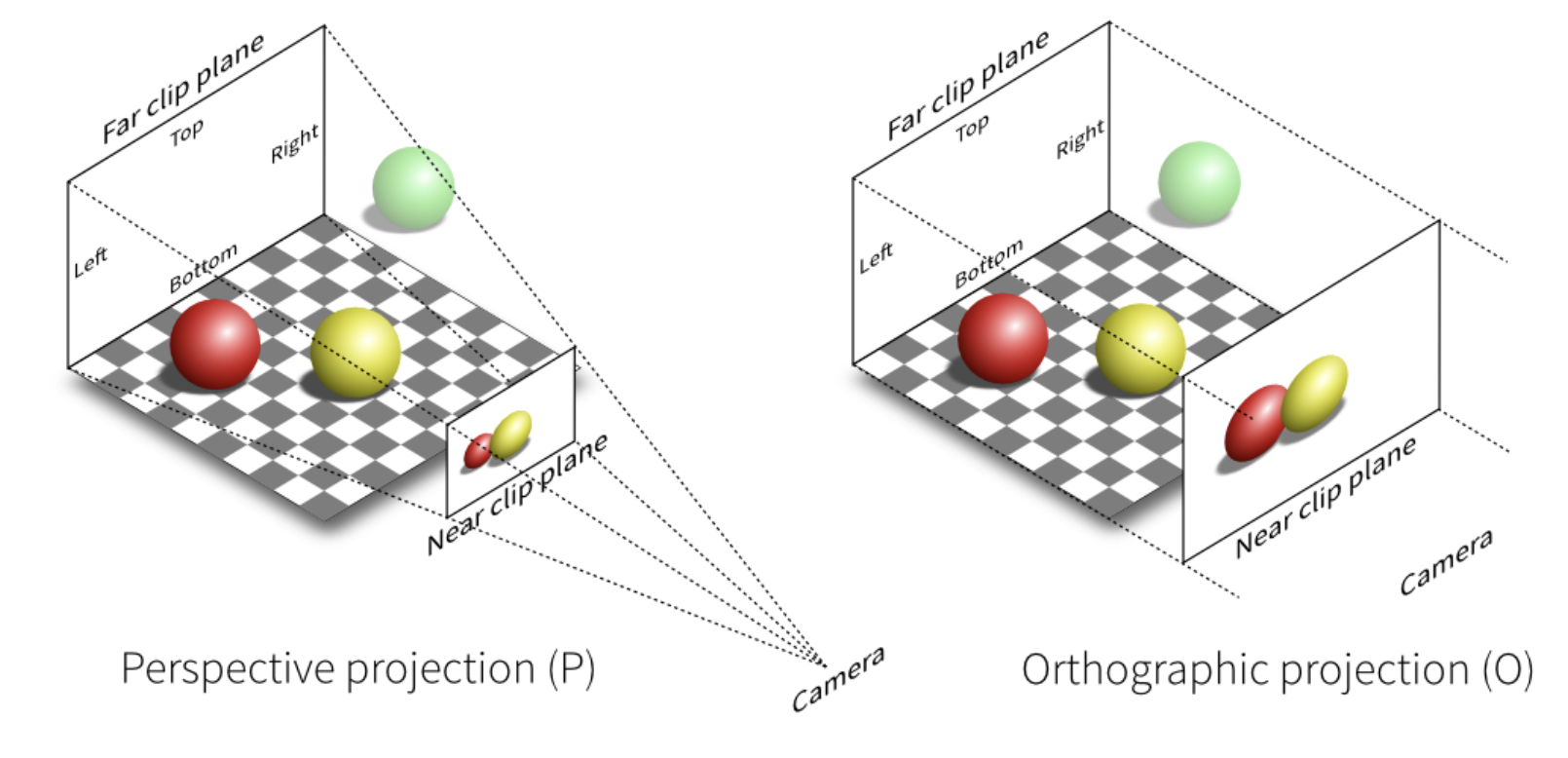 - Orthographic Projection : 이 프로젝션은 절두체 안에 있는 모든 오브젝트들을 원근과 왜곡 없이 표현합니다. 최종적으로 렌더링 되는 결과물을 보면 프로젝션내의 모든 오브젝트들을 그대로 압축해서 보여주는 느낌이 듭니다.