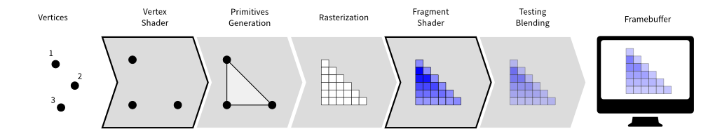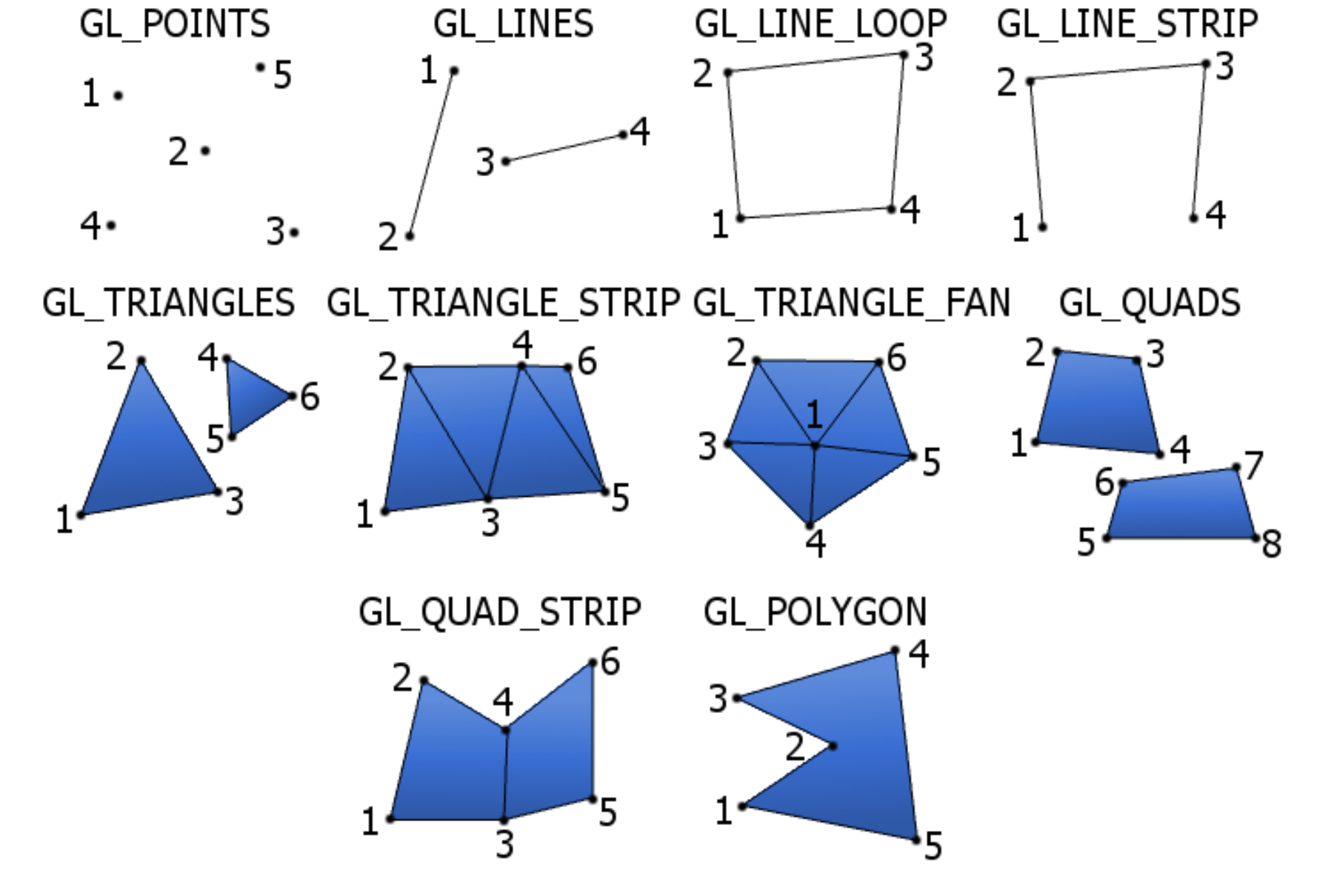 - primitive : 점, 선, 삼각형 등 기본 도형들, OpenGL이 무엇을 그려야하는 지 알려준다.