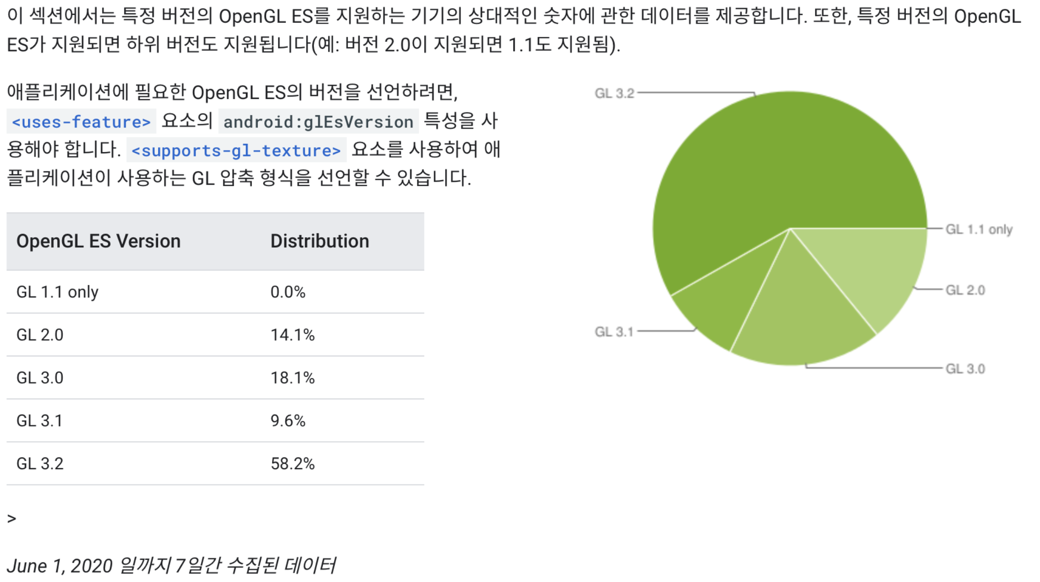 - 안드로이드 5.0(API Level 21) 이상 : OpenGL ES 3.1