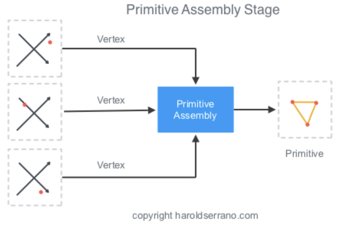 - vertex들의 위치정보를 이용하여 삼각형 같은 primitive를 만들어 낸다. vertex들을 서로 연결할때 일정한 순서에 따라 연결이 된다.