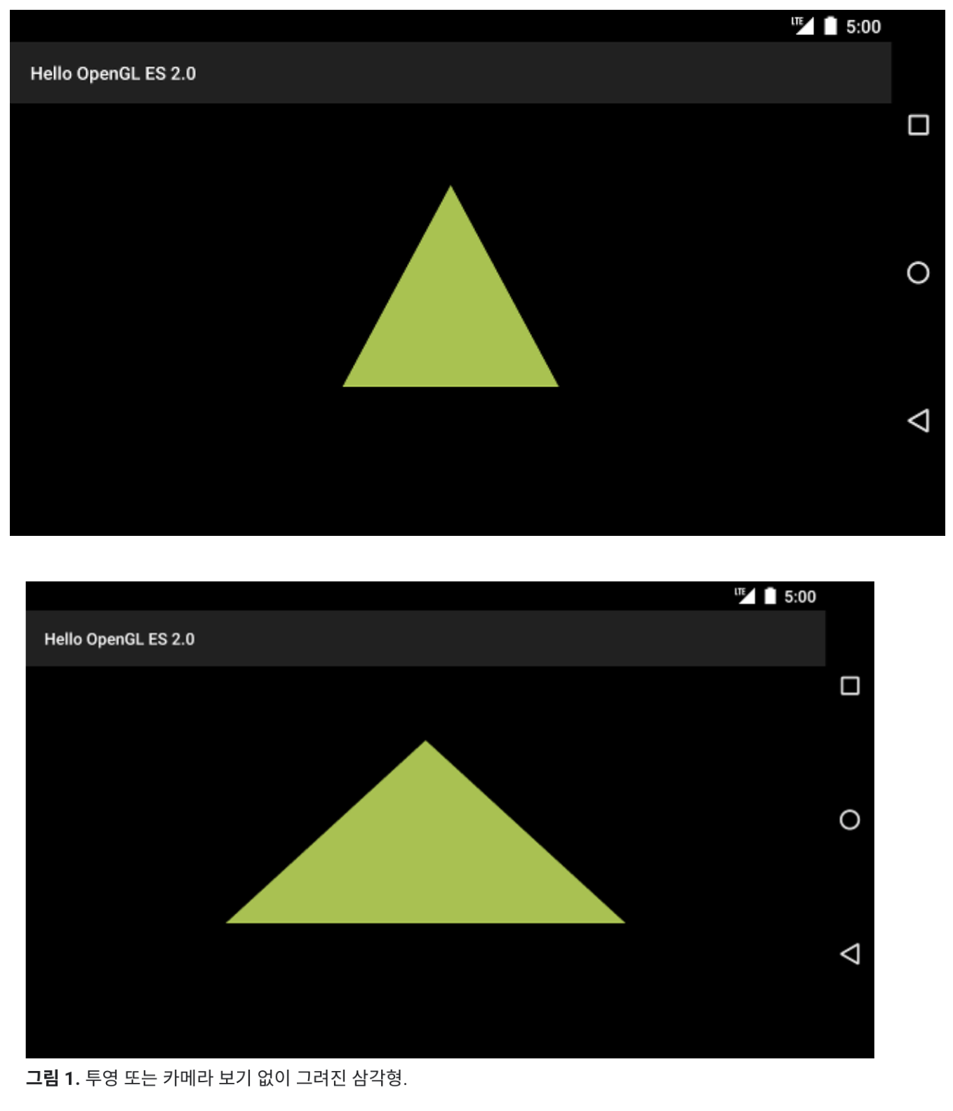 - 이 변환은 그린 객체가 표시되는 GLSurfaceView의 너비와 높이에 기반하여 객체의 좌표를 조정합니다. 일반적으로 투영 변환은 렌더기의 onSurfaceChanged() 메서드에서 OpenGL 뷰의 비율이 설정되거나 변경될 때만 계산해야 합니다.